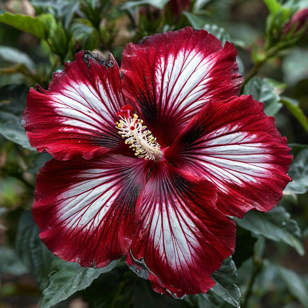 - Красный цвет: главная особенность этого сорта — его яркий и насыщенный красный цвет. Цветки гибискуса «Пурпл Мистик» обладают глубоким и чистым красным оттенком, который делает их особенно эффектными и привлекательными.